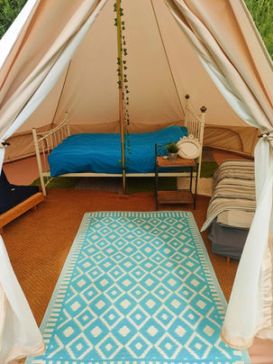 Our spacious bell tents have a super-comfortable double bed and extra single beds if you wish. Book your little bit of wild heaven.